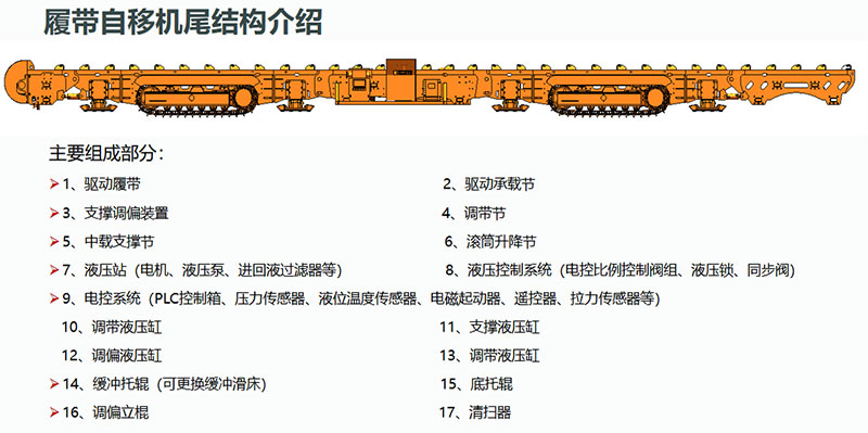 履帶式自移機尾由剛性皮帶機尾與履帶行走底盤組成,采用鉸接式連接結構。其核心部件包括: